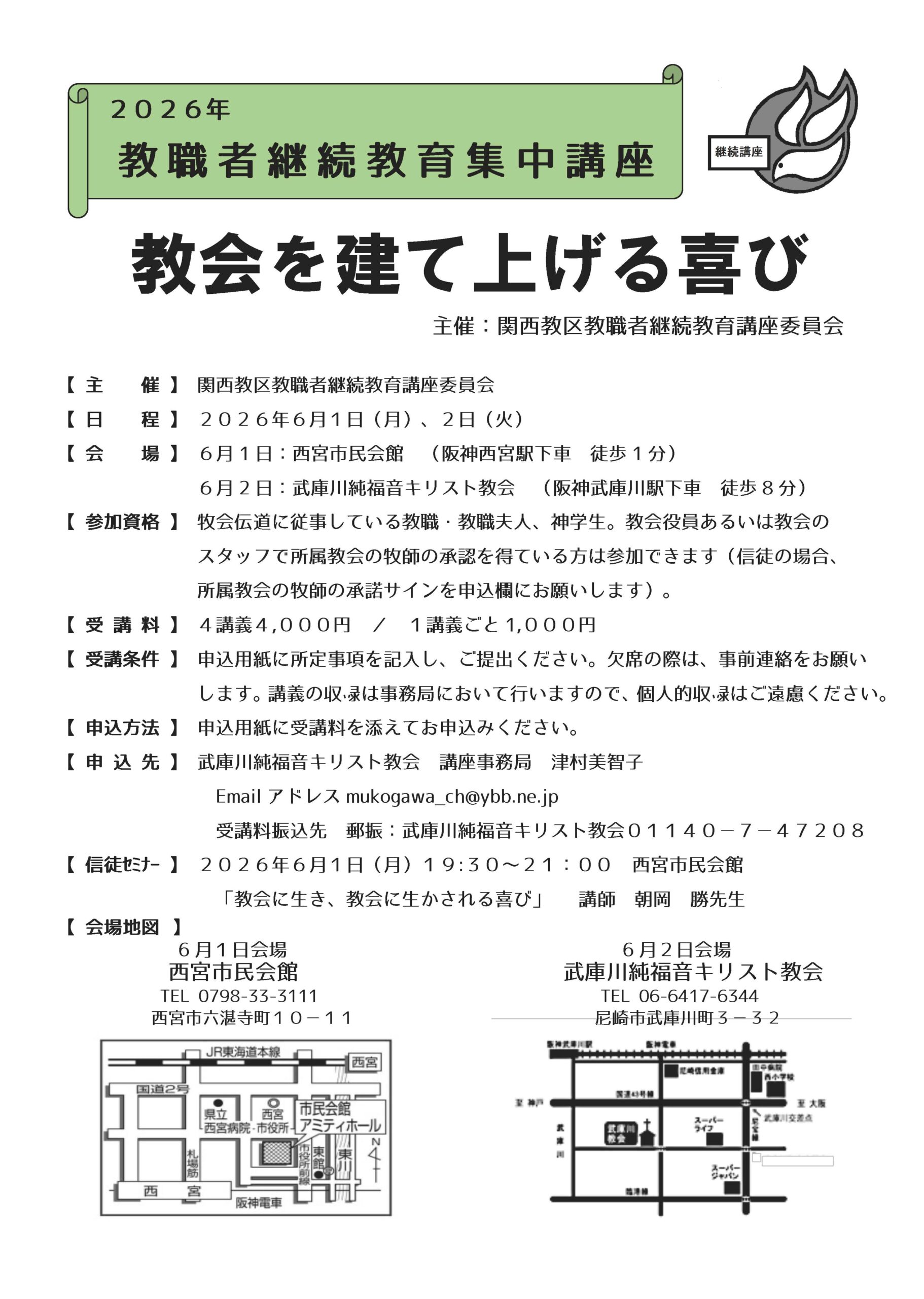 2026/6/1-2 継続教育集中講座「教会を建て上げる喜び」朝岡 勝師